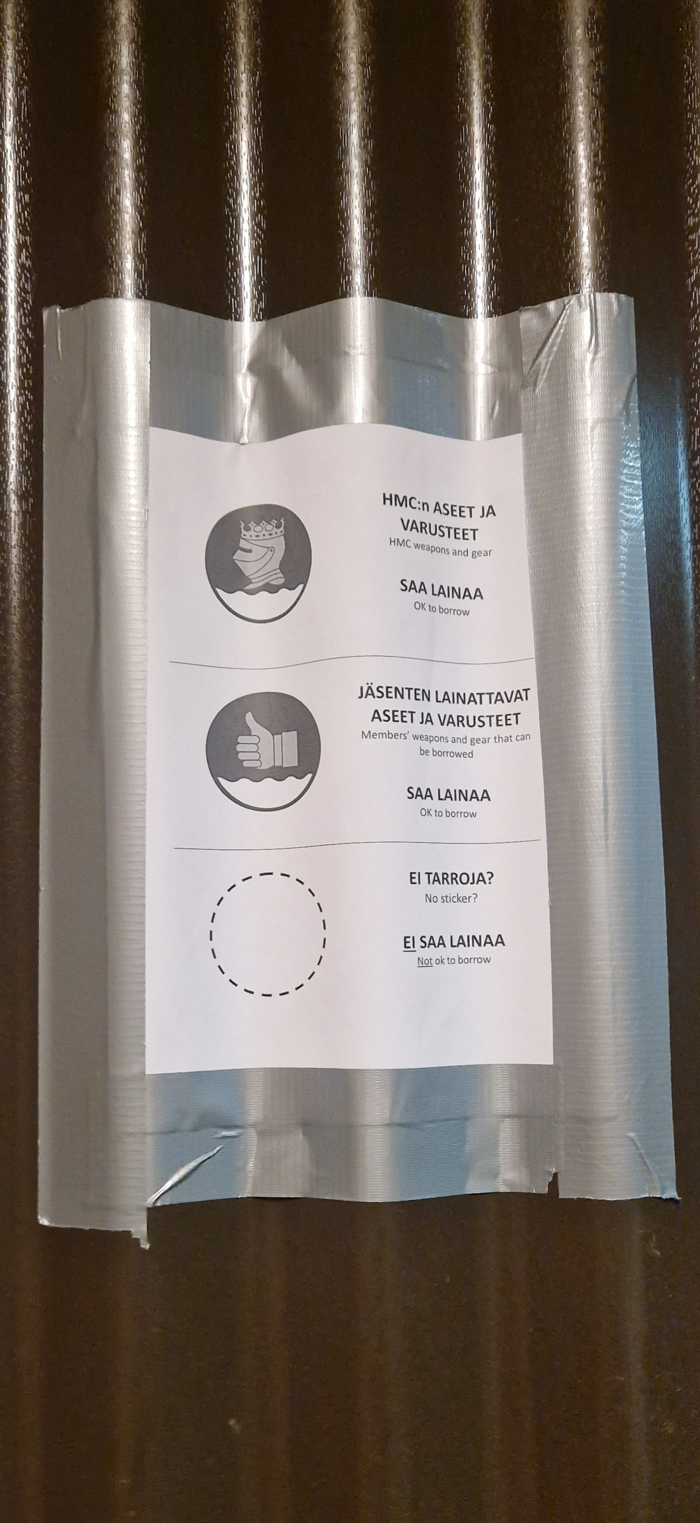 With the rebuilding of the storage comes also new guidelines for borrowing gear. HMC-owned gear, and member weapons that are OK for borrowing, are now marked with stickers (see images above). Unmarked gear is not allowed for use.