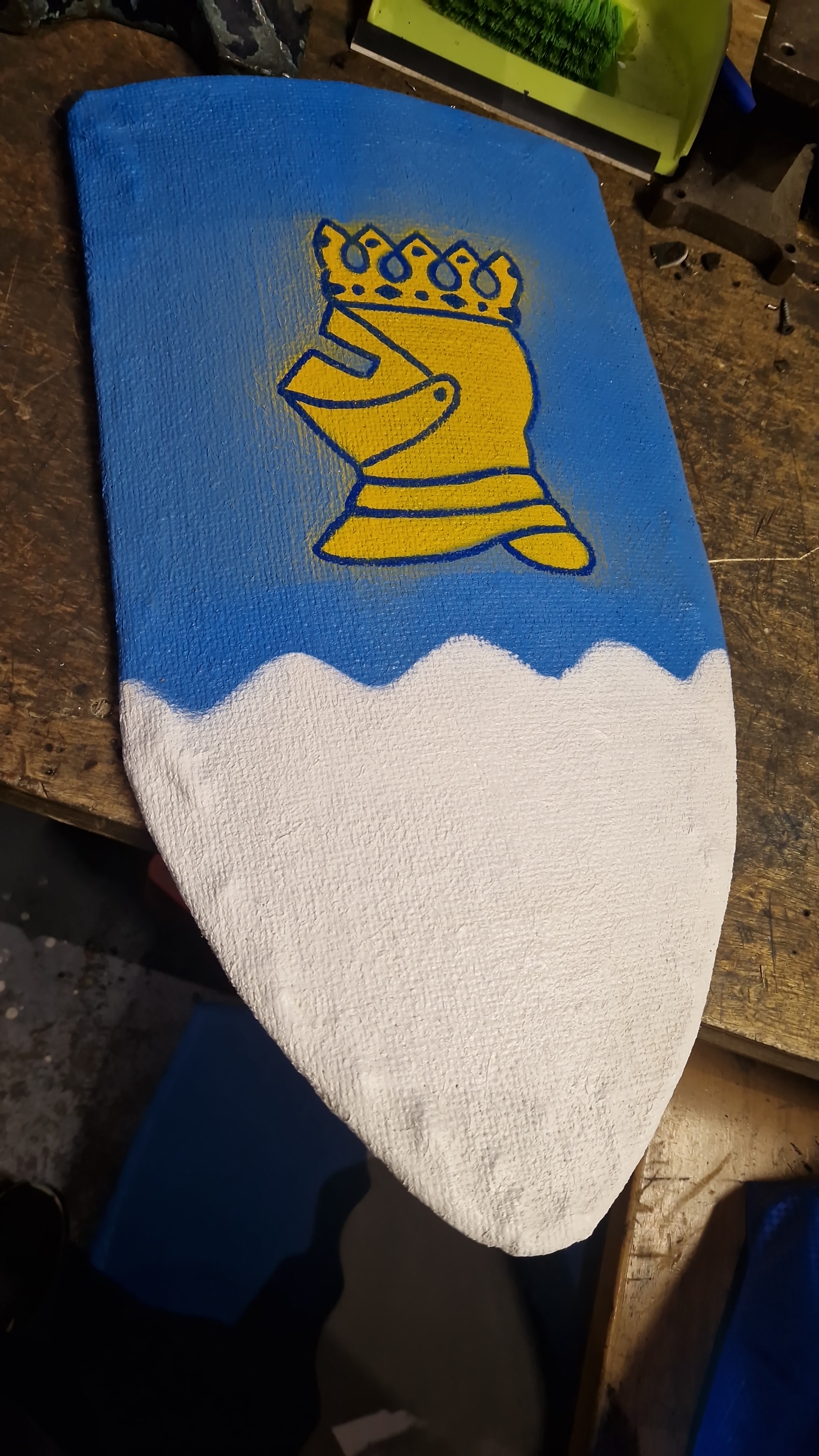 Yhden käden asetelineen yläpuolelle on valmisteltu tilaa vielä valmisteilla olevien seuran lainakilpien lisäämistä varten. Tällä hetkellä kaikki kilvet on maalattu ja odottavat raakanahka reunusta. Yhdessä kaksintaistelukilvessä on sininen pohjamaali ja toisessa on vielä vain kangas. Bucklerien osat on vielä leikkaamatta.