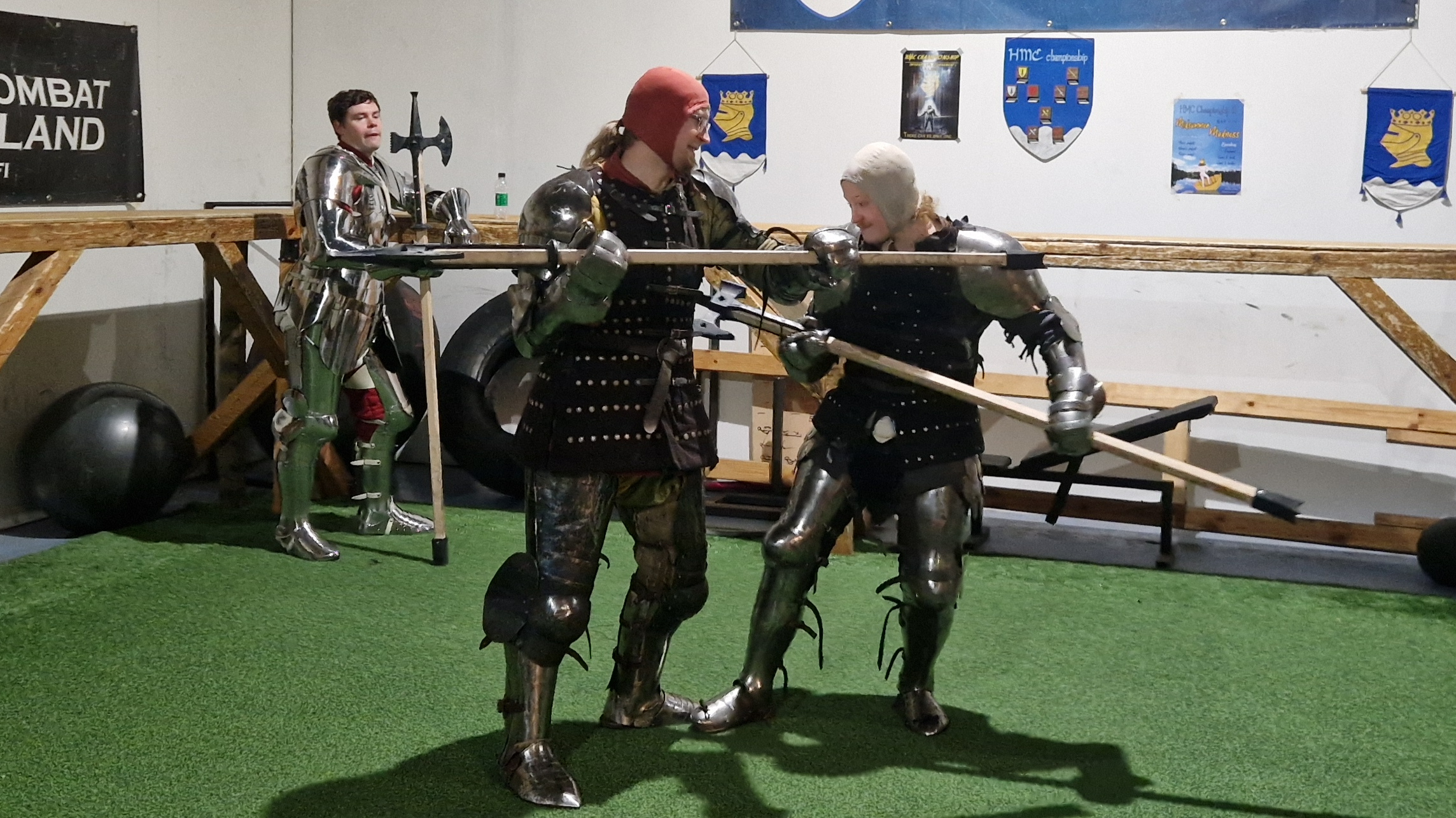 Our club repertoire is expanding! Several of our members have started training harnisfechten (armoured HEMA) techniques on Tuesday evenings, and with the addition of the 2vs2 women’s category to MCSF Liiga, it is all the more important to hold regular trainings for women to work towards success in this category.