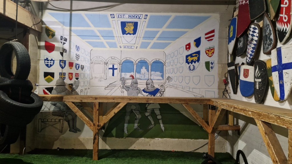 During 2024, we made a number of improvements to our gym. After the update of the list to the new bar-top, we also opened a doorway through the previously solid wall opposite the entrance. New storage solutions were built for shields, weapons, soft gear, gauntlets, gym equipment, and so on. We cleaned out a lot of unused equipment, and improved the storage of our loaner armour. We even added a notice board with a calendar to keep track of what’s going on at HMC, and a novelty lamp!